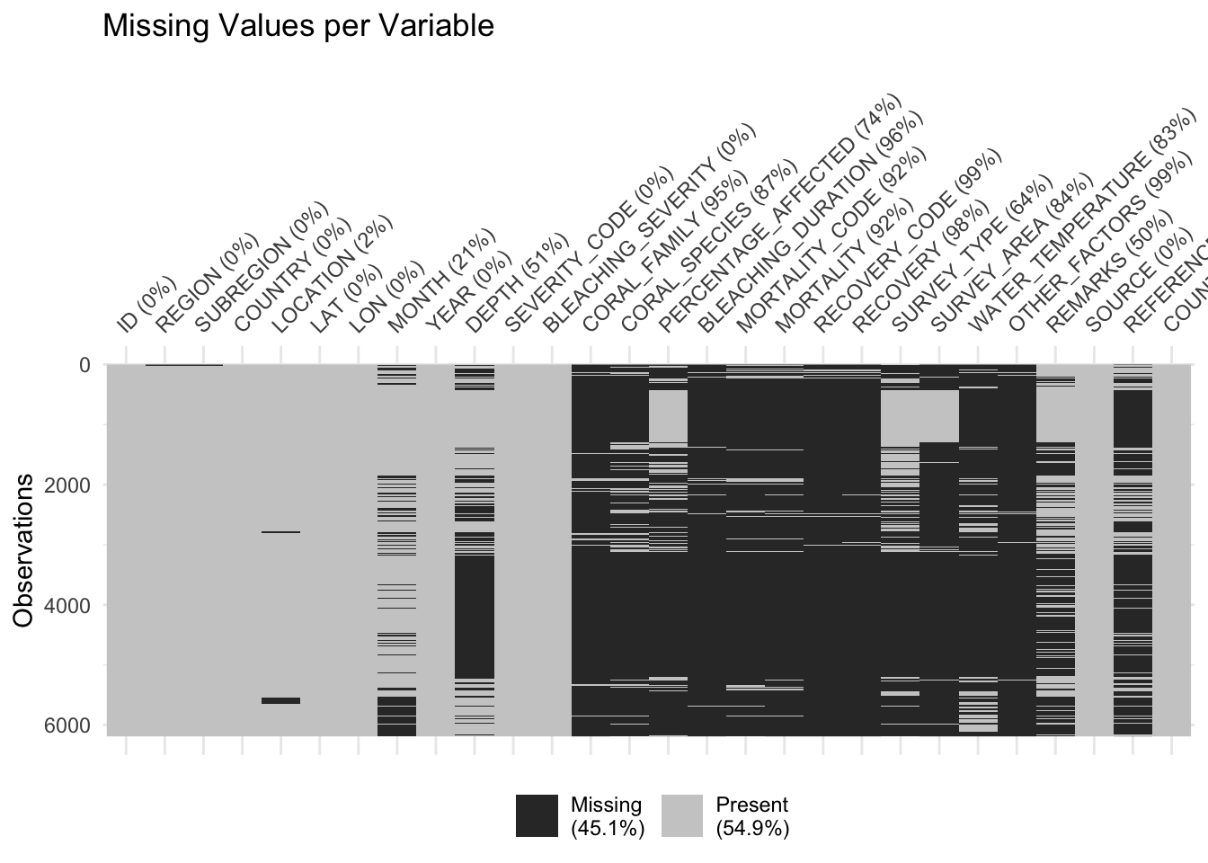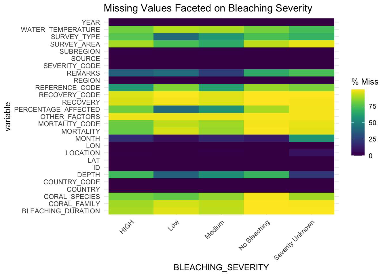 This graph depicts the percentage of missing values per column faceted on BLEACHING_SEVERITY. BLEACHING_SEVERITY is an important variable in understanding the level of coral bleaching recorded over time at different locations. We can use this visualization to understand if any of the outcomes of BLEACHING_SEVERITY contains a significant percentage of missing data.