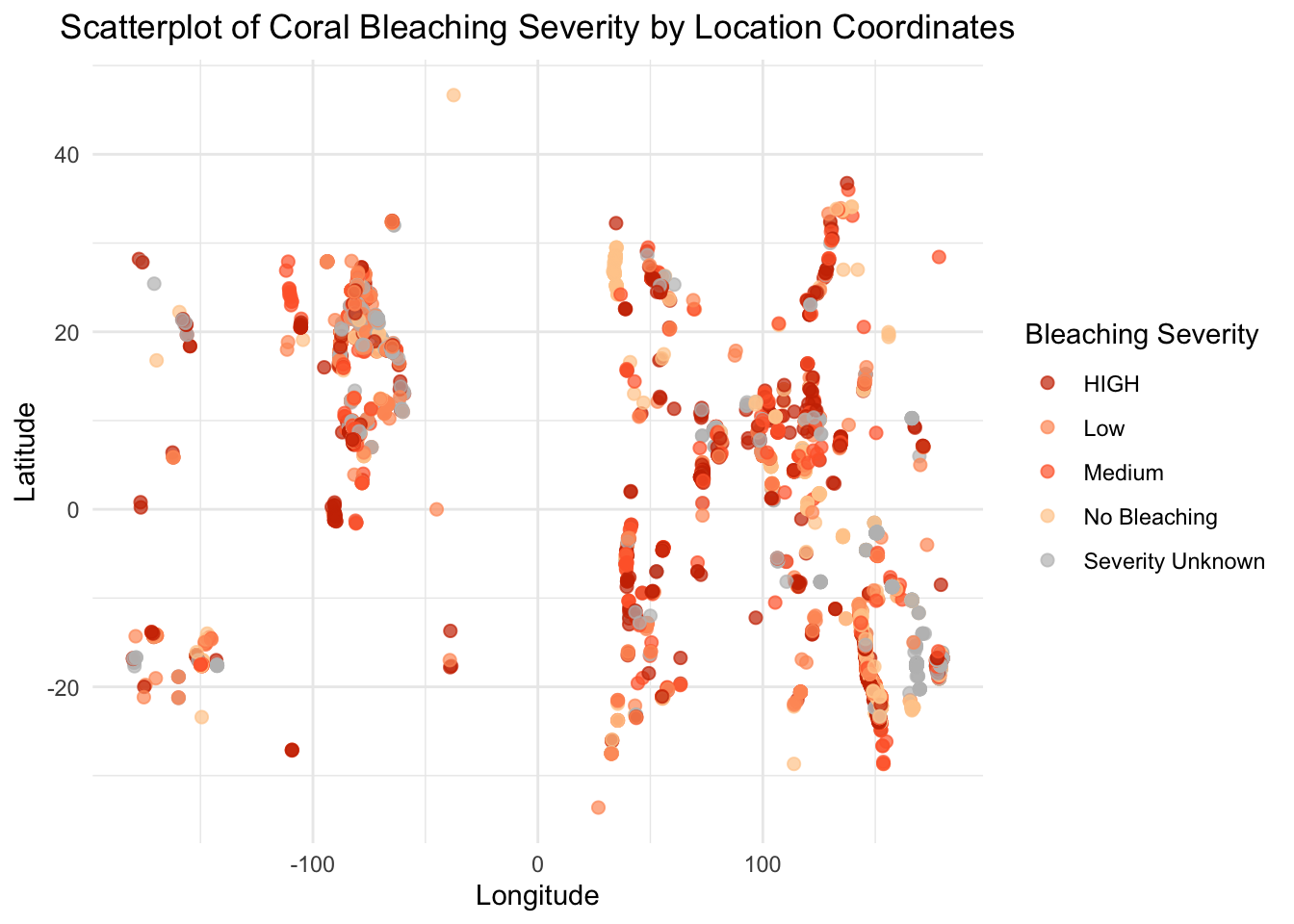 # Removing an outlier by filtering LAT and LON within a reasonable range# Replace the range with appropriate limits after inspecting the datadf_filtered <- df |>filter(LAT >-90& LAT <90, LON >-180& LON <180) # Latitude and longitude should be within these bounds# Ensure BLEACHING_SEVERITY is a factordf_filtered$BLEACHING_SEVERITY <-factor(df_filtered$BLEACHING_SEVERITY)# Create the scatterplot without the outlierggplot(df_filtered, aes(x = LON, y = LAT, color = BLEACHING_SEVERITY)) +geom_point(size =2, alpha =0.7) +scale_color_manual(values =c("No Bleaching"="#FFCC99", "Low"="#FF9966", "Medium"="#FF6633", "HIGH"="#CC3300", "Severity Unknown"="gray")) +labs(x ="Longitude",y ="Latitude",color ="Bleaching Severity",title ="Scatterplot of Coral Bleaching Severity by Location Coordinates" ) +theme_minimal() +theme(plot.title =element_text(hjust =0.5),legend.position ="right" )