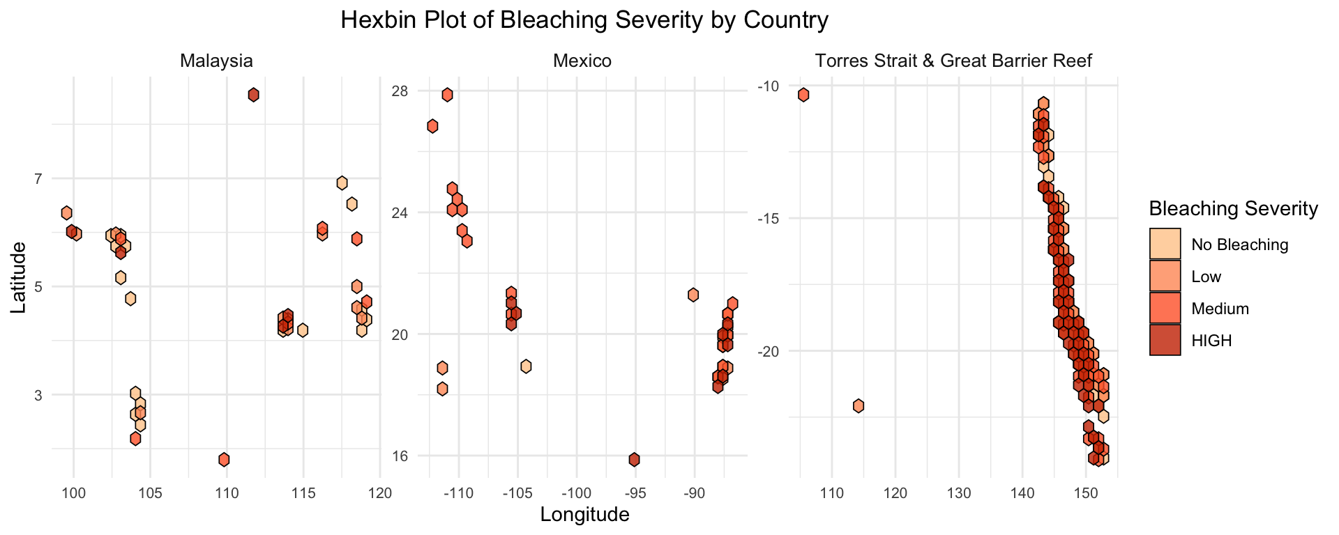 This hexbin plot portrays the spatial distribution of coral bleaching severity for the three countries with the highest number of observations: Malaysia, Mexico, and the Torres Strait & Great Barrier Reef region in Australia. Each hexagon represents the density level of observations within the region, with colors indicating bleaching severity levels from “No Bleaching” to “HIGH”.