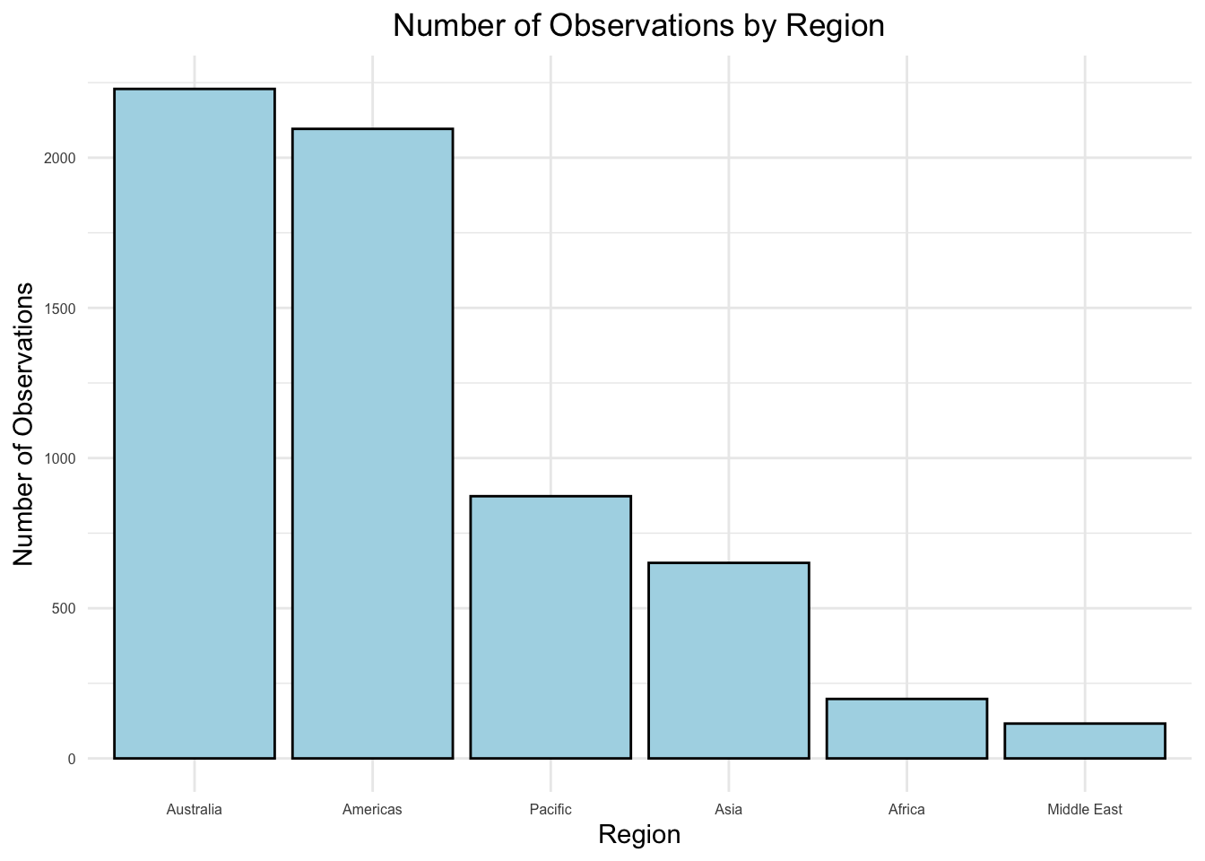This bar chart demonstrates the total number of coral bleaching observations, all of various bleaching degrees, across six regions. Australia and the Americas have the highest number of observations, both over 2000, due to the presence of extensive coral reef systems (e.g., the Great Barrier Reef) and stronger monitoring efforts. The Pacific and Asia follow with moderate observation counts, reflecting their significant reef areas but potentially less monitoring capacity compared to Australia and the Americas. Africa and the Middle East have the fewest observations, possibly due to smaller reef systems and limited monitoring resources.