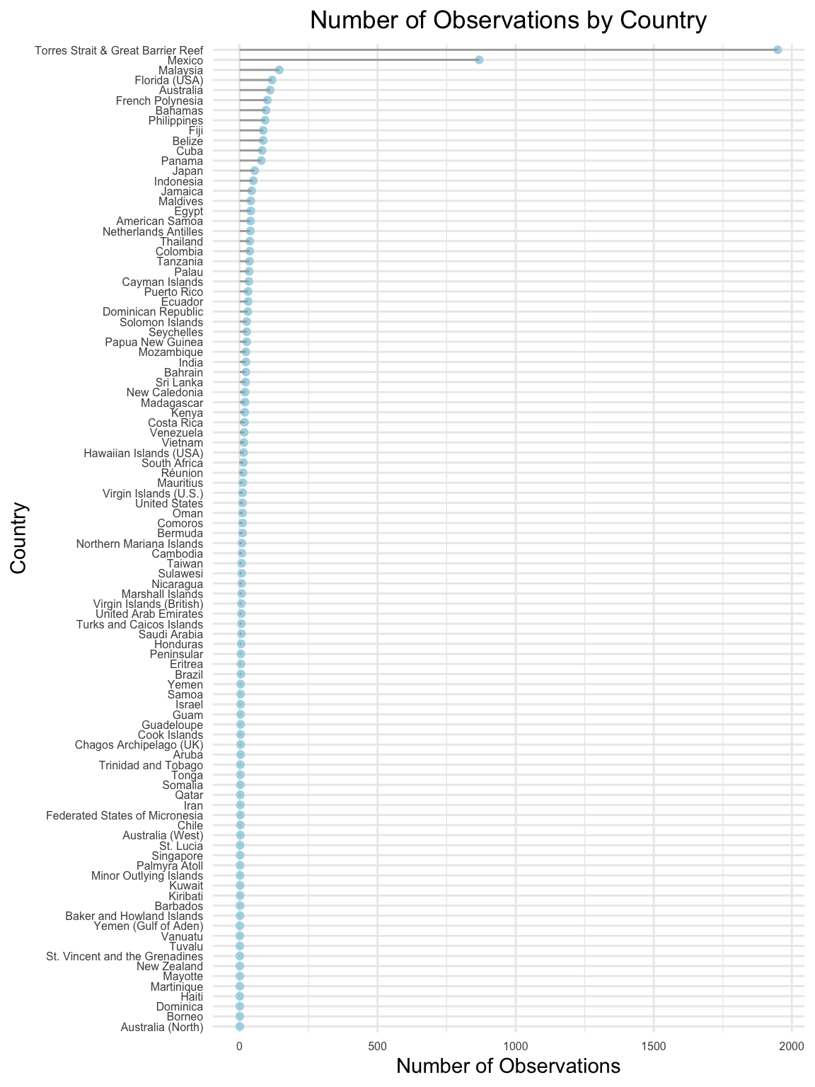 This Cleveland dot plot displays the total number of observations for each country. Australia, particularly the Torres Strait & Great Barrier Reef region, dominates the data with the highest number of observations, reflecting its extensive reef system and well-funded research initiatives. Other countries, such as Mexico, Malaysia, and the United States (specifically Florida), also show high observation counts, likely due to their substantial reef coverage and strong conservation efforts. In contrast, many countries have significantly fewer observations, possibly indicating limited monitoring resources or smaller reef areas. The steep drop-off in observation counts after the top few countries highlights a variable global distribution of monitoring efforts.