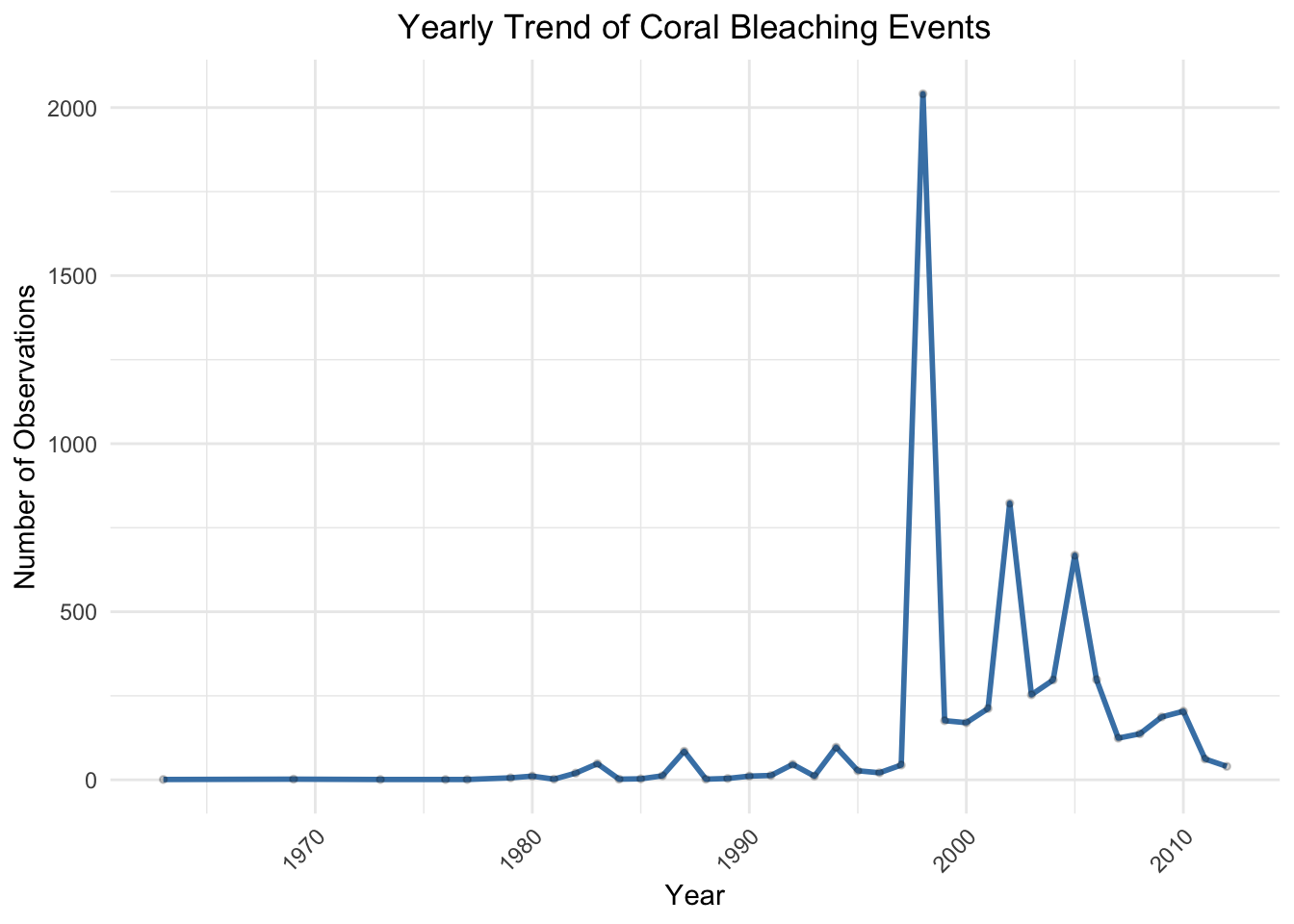 The line plot illustrates how the number of observations changes over time from the 1970s to the early 2010s. The number of observations remained consistently low from the 1970s through the 1980s, with a notable spike occurring just before the year 2000. This spike may reflect a combination of intensified monitoring efforts, global warming impacts, or a particularly severe bleaching event. After this peak, the number of recorded events fluctuates, but remains higher than pre-2000 levels.