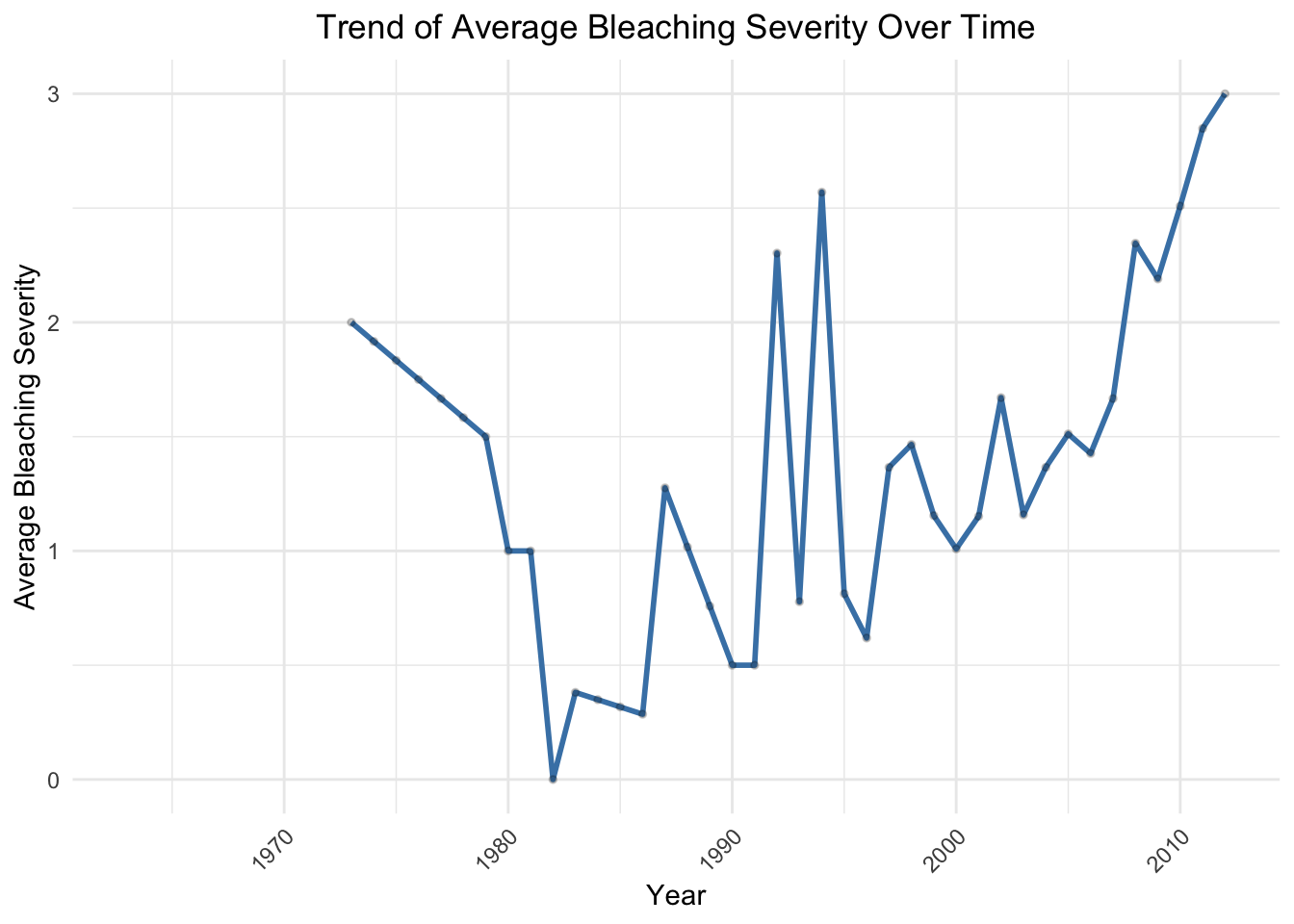 There is a notable rise in average bleaching severity beginning in the 1990s, aligning with trends in warming temperatures and increased coral stress. What is most alarming is the steep, upward trajectory post-2000, with the highest average severity occurring in the early 2010s. This indicates a concerning trend of increasingly severe bleaching events in more recent years.
