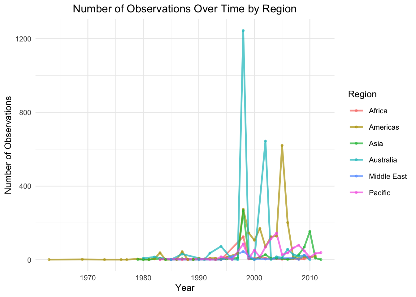In this line chart, we observe the total number of observations over time grouped by region. The data highlights a sharp spike in observations in Australia around the year 2000, supporting our previous observations and insights. The Americas also display notable peaks, though less pronounced than Australia, followed by Asia. This visualization emphasizes the geographic and temporal disparities in monitoring efforts, with significant gaps in data for some regions, such as Africa and the Middle East.