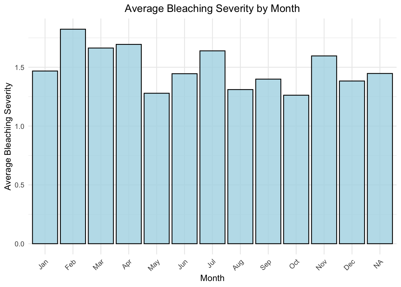 # Convert BLEACHING_SEVERITY to numeric if necessaryseverity_mapping <-c("No Bleaching"=0, "Low"=1, "Medium"=2, "HIGH"=3, "Severity Unknown"=NA)df$BLEACHING_SEVERITY_NUM <- severity_mapping[df$BLEACHING_SEVERITY]# Aggregate data to calculate the average bleaching severity per monthdf_monthly <- df |>group_by(MONTH) |>summarize(avg_bleaching_severity =mean(BLEACHING_SEVERITY_NUM, na.rm =TRUE), .groups ="drop")ggplot(df_monthly, aes(x =factor(MONTH, levels =1:12), y = avg_bleaching_severity)) +geom_bar(stat ="identity", fill ="lightblue", color="black", alpha =0.8) +labs(x ="Month",y ="Average Bleaching Severity",title ="Average Bleaching Severity by Month" ) +scale_x_discrete(labels =c("1"="Jan", "2"="Feb", "3"="Mar", "4"="Apr","5"="May", "6"="Jun", "7"="Jul", "8"="Aug","9"="Sep", "10"="Oct", "11"="Nov", "12"="Dec" )) +theme_minimal() +theme(plot.title =element_text(hjust =0.5),axis.text.x =element_text(angle =45, hjust =1) )